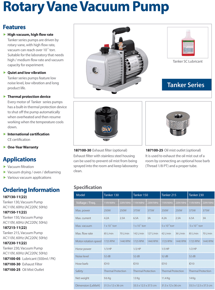 - Bơm chân không Rocker Tanker 150 sử dụng dầu bôi trơn Tanker SC có dung tích đóng chai 500 ml (độ nhớt tại 400C: 47mm2/s), có độ bền cao, chi phí bảo dưỡng, sửa chữa thấp.