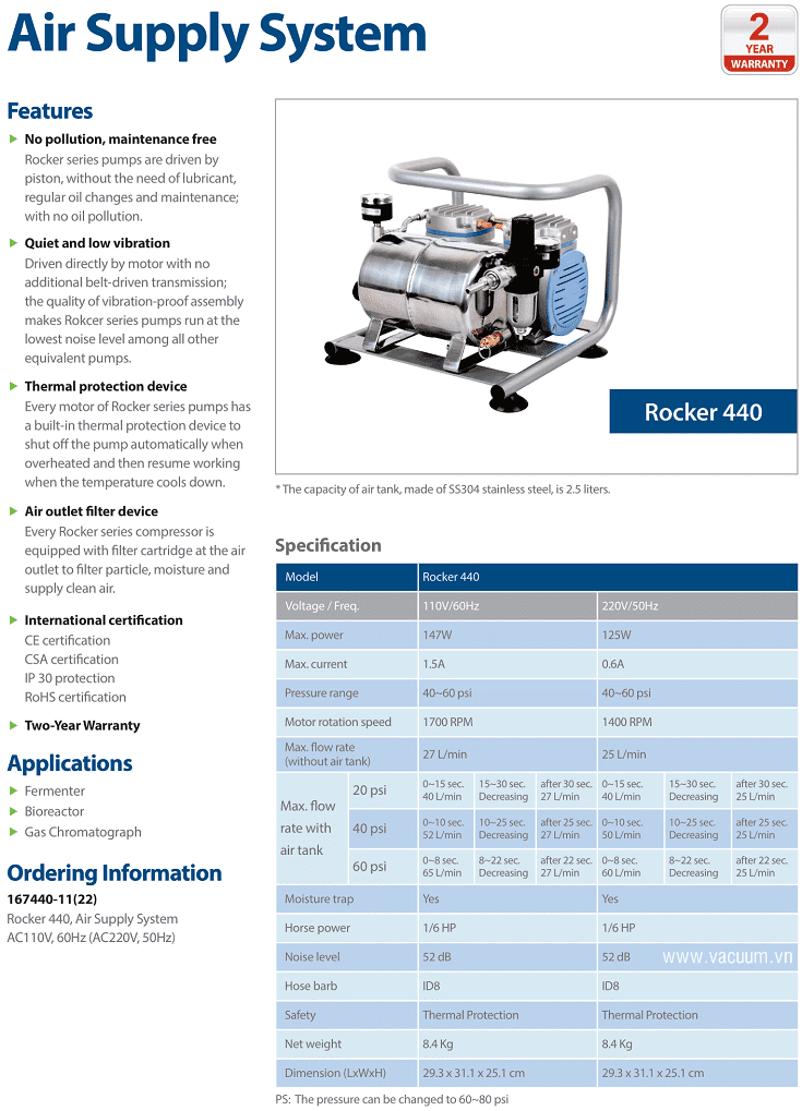 - Máy nén khí Rocker 440 được sản xuất tại Nhà máy của Rocker Scientific Co.,Ltd ở Cao Hùng - Đài Loan. Made in Taiwan.