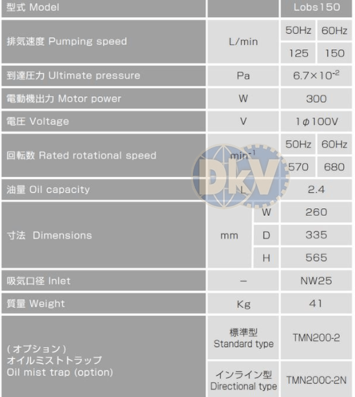 - Bơm chân không Sato Lobs 150 sử dụng động cơ: 300 W, điện áp 1ph/100V/50 Hz, tốc độ vòng quay: 570 vòng/phút, size cổng kết nối khí vào/ra: NW25.