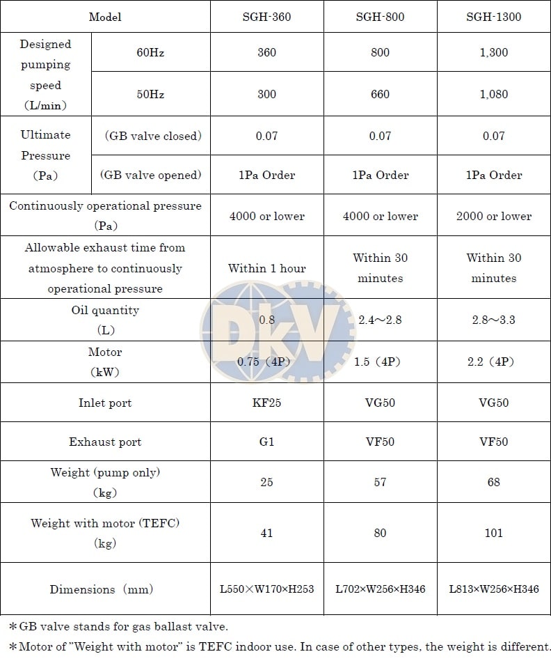 - Bơm chân không Shinko Seiki SGH-800, bơm hút chân không Shinko Seiki SGH-800, Shinko Seiki oil sealed rotary vacuum pump SGH-800: là loại bơm chân không vòng dầu (oil-flooded), 2 cấp (dual stage, có lưu lượng max: 660 lít/phút (39.6 m3/h), độ chân không sâu nhất: 0.07 Pa | 7.10-4 mbar (khi đóng chấn lưu khí Gas Ballast) và 1 Pa | 1.10-2 mbar (khi mở chấn lưu khí Gas Ballast, option) chuyên dùng để hút chân không trong công nghiệp..