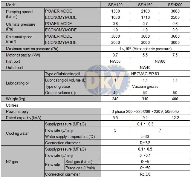 - Bơm chân không Shinko Seiki SSH100 sử dụng động cơ: 3.7 kW, điện áp 3ph/200-230V/50Hz, tốc độ vòng quay động cơ: 3.600 vòng/phút, size kết nối (vào/ra): NW50/NW40.
