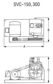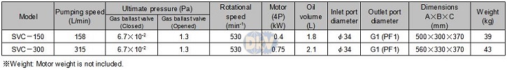 - Bơm chân không Shinko Seiki SVC-150 sử dụng động cơ: 0.4 kW (điện áp tùy chọn), tốc độ vòng quay động cơ: 530 vòng/phút, size đầu kết nối : 34/G1. Sử dụng dây đai truyền động.
