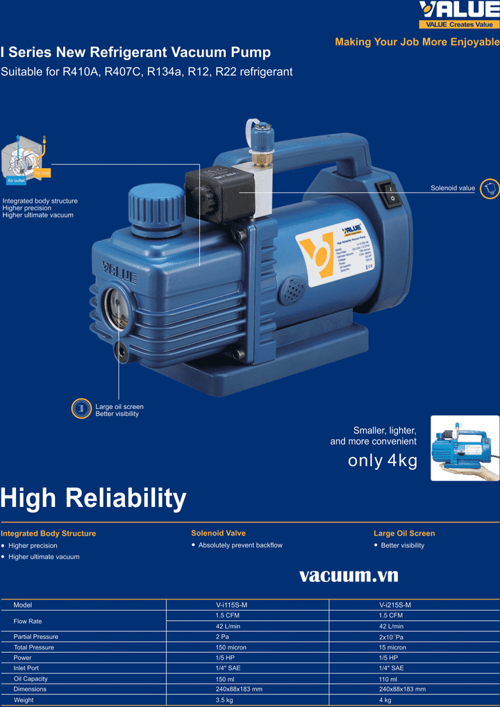 - Bơm chân không Value V-i115S-M, Value oil Lubricated Rotary Vane Vacuum Pumps V-i115S-M thuộc dạng bơm hút chân không vòng dầu (oil-flooded), 1 cấp (single stage), loại nhỏ mini, có lưu lượng: 2.5 m3/h (1.5 cfm), độ chân không đạt: 2x10-2 mbar (2 Pa) chuyên dùng để hút chân không trong dân dụng, phòng thí nghiệm và công nghiệp.