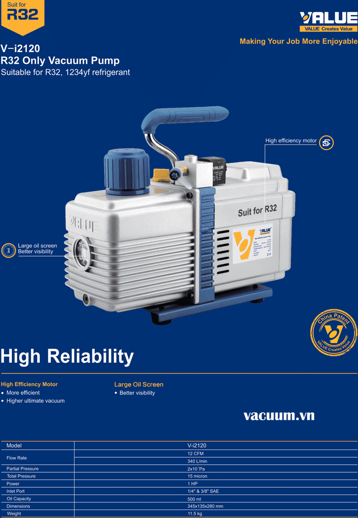 - Bơm chân không Value V-i2120, Value oil Lubricated Rotary Vane Vacuum Pumps V-i2120 thuộc dạng bơm hút chân không vòng dầu (oil-flooded), 2 cấp (dual stage), loại nhỏ mini, có lưu lượng: 20.3 m3/h (12 cfm), độ chân không đạt: 2x10-3 mbar (0.2 Pa) chuyên dùng để hút chân không trong dân dụng, phòng thí nghiệm và công nghiệp.
