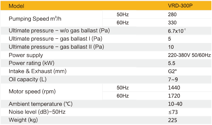 - Bơm chân không Value VRD-300P có độ ồn max: 73 dB(A). Sử dụng động cơ: 5.5 kW, điện áp 380- 400V/50-60Hz/3ph tiêu chuẩn DIN EN 60034, tốc độ vòng quay động cơ:1.440 vòng/phút.