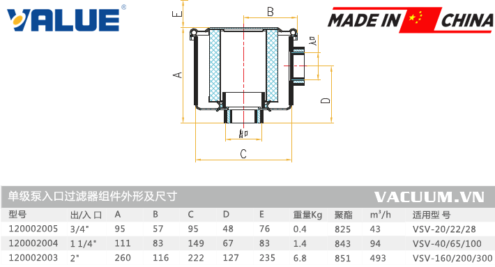- Lọc gió chân không Value 120002005, Value air inlet filter 120002005 chuyên dùng cho các loại bơm chân không vòng dầu Value VSV-020, Value VSV-028, dùng cho lọc khí đường hút của bơm chân không (vòng dầu và khô) với độ mịn 10 micon (option: 5 micron). Với ren dương G3/4" (kết nối với cổ hút bơm chân không) và ren âm G3/4" (kết nối với đường khí cần hút). Phù hợp với các bơm chân không có lưu lượng hút < 43 m3/h.