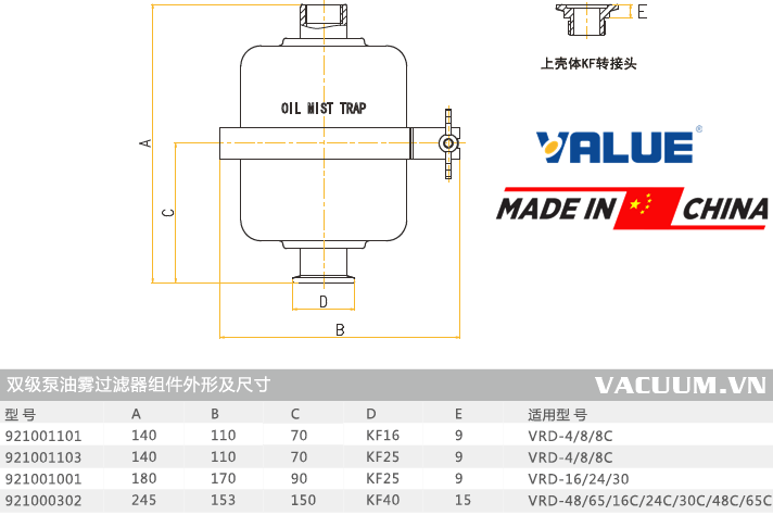 LỌC TÁCH DẦU CHÂN KHÔNG VALUE VOT-65C | VALUE OIL MIST TRAP FOR FILTERING VOT-65C | KF 40
