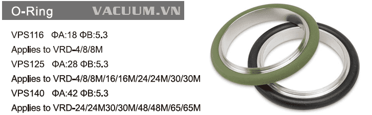 - Vòng đệm chân không Value VPS125, Value vacuum centering VPS125: chuyên dùng để lót vòng kẹp, làm kín khi kẹp mặt bích cho bơm chân không. Vòng đệm chân không Value VPS125 phù hợp với hệ kẹp KF 25, được chế tạo từ vật liệu STS304, NBR/VITON đảm bảo cứng vững, kín khít, bền lâu.