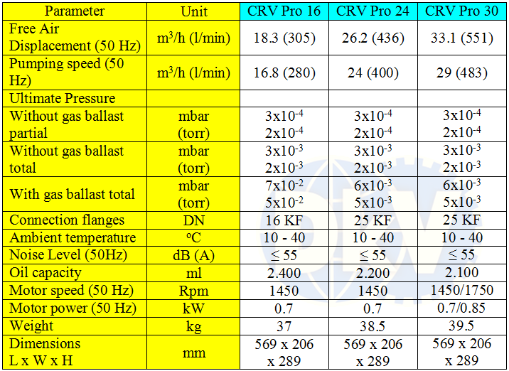 - Bơm chân không Welch CRV pro 30, Welch vacuum pump CRV pro 30: thuộc dạng bơm hút chân không vòng dầu (oil-flooded), 2 cấp (dual stage), cỡ trung bình, có lưu lượng: 29 m3/h, độ chân không đạt: 3.10-3 mbar (khi đóng chấn lưu khí Gas ballast), 6.10-3 mbar (khi mở chấn lưu khí Gas ballast), độ chân không tuyệt đối 3.10-4 mbar (khi đóng chấn lưu khí Gas ballast), chuyên dùng để hút chân không trong công nghiệp.