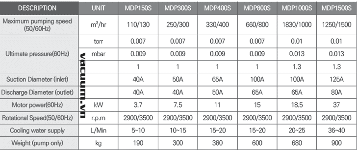 - Bơm chân không khô trục vít Woosung MDP300S, Woosung dry screw vacuum pumps MDP300S thuộc dạng bơm hút chân không khô. không dầu, kiểu trục vít, có lưu lượng: 250 m3/h, độ chân không đạt: 0.007 Torr | 9.10-3 mbar, chuyên dùng để hút chân không trong công nghiệp.