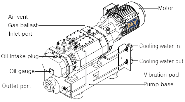 - Bơm chân không khô trục vít Woosung MDP400B được làm mát bằng nước cưỡng bức (áp nước < 7 bar, nhiệt độ nước: 5 - 350 C, lưu lượng chảy 15 - 20 lít/phút, ren kết nối PT(JIS): 1/2" (1SA), chảy quanh thân bơm, giúp giải nhiệt tốt khi vận hành. Woosung khuyến cáo sử dụng dầu bôi trơn hộp số: Shell T-68 và mỡ bôi trơn vòng bi: Mobil 1.