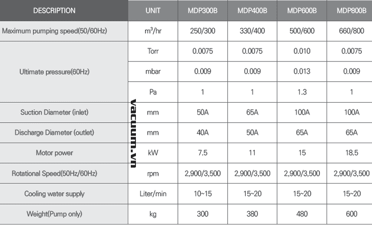 - Bơm chân không khô trục vít Woosung MDP400B, Woosung dry screw vacuum pumps MDP400B: thuộc dạng bơm hút chân không khô. không dầu, kiểu trục vít, có lưu lượng: 330 m3/h, độ chân không đạt: 0.0075 Torr | 9.10-3 mbar, chuyên dùng để hút chân không trong công nghiệp.