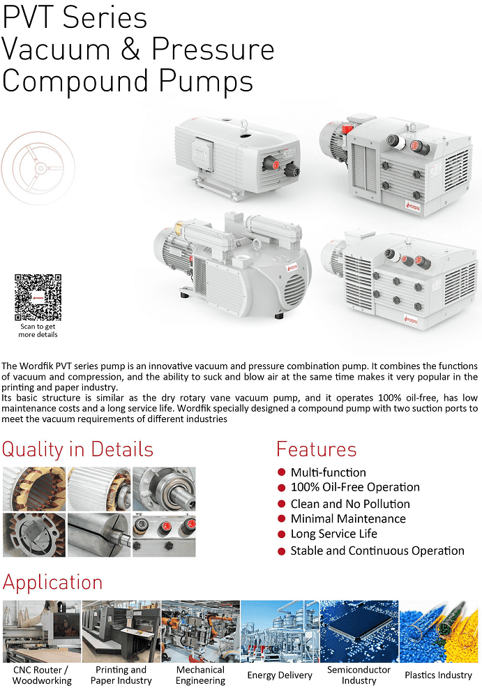 - Bơm chân không Wordfik PVDT100 bảo trì bảo dưỡng đơn giản, có chi phí thấp, chủ yếu thay thế cánh gạt và lọc gió, không dầu mở, dòng khí sạch.