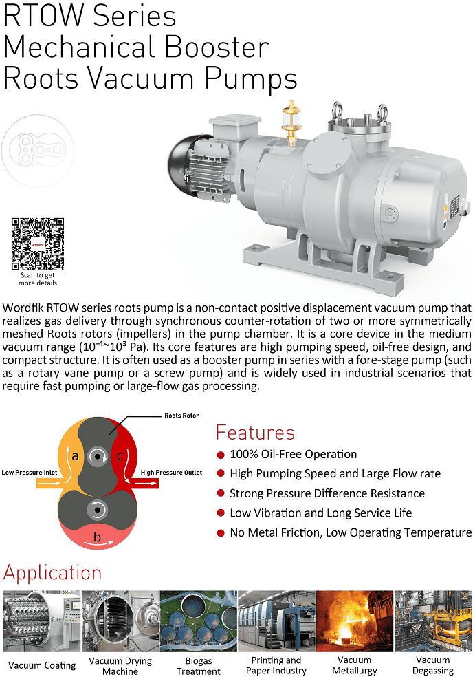 - Bơm tăng áp chân không Wordfik RTOW150 không sử dụng các chất bôi trơn nội bộ, ít có dòng chảy ngược của dầu chân không, tạo ra môi trường chân không sạch sẽ.