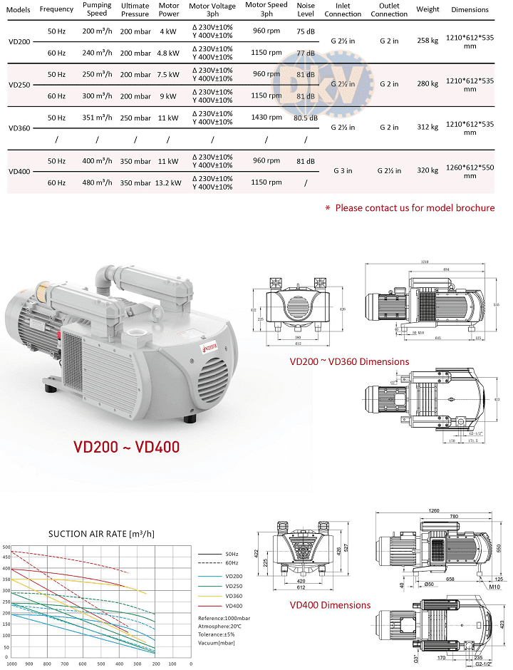 - Bơm chân không Wordfik VD400, bơm hút chân không Wordfik VD400, Wordfik dry rotary vane vacuum pump VD400: là loại bơm chân không khô, không dầu, cánh gạt, cỡ lớn dùng trong dây chuyền công nghiệp. Bơm chân không Wordfik VD400 có lưu lượng max: 400 m3/h, độ hút chân không sâu nhất max: 350 mbar.