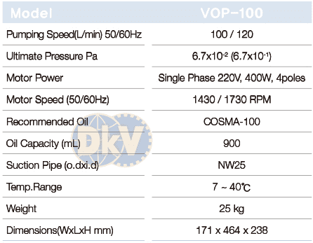 - Bơm chân không Daihan VOP-100 có độ ồn max: 60 dB(A). Sử dụng động cơ: 0.4 kW, điện áp 220V/50Hz/1ph, tiêu chuẩn DIN EN 60034, tốc độ vòng quay động cơ: 1.430 vòng/phút.
