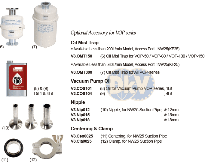 - Để việc vận hành bơm chân không Daihan VOP-100 hoàn chỉnh, quý khách lên lắp thêm: áp kế (đồng hồ đo chân không - vacuum gauge) để giám sát độ chân không của bơm. Cũng như lọc gió đầu vào (air inlet filter) để hạn chế bụi, dị vật lọt vào bơm và lọc tách dầu (oil mist filter) đường khí đầu ra Daihan V3.OMT150 hoặc Daihan V3.OMT300 để hạn chế dầu thoát ra ngoài.