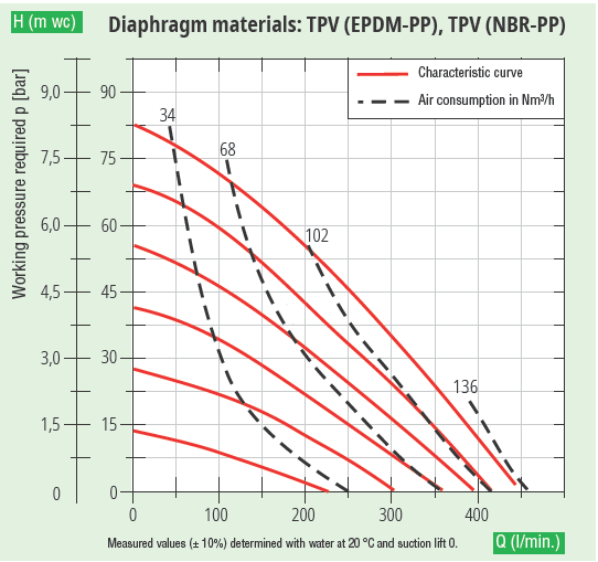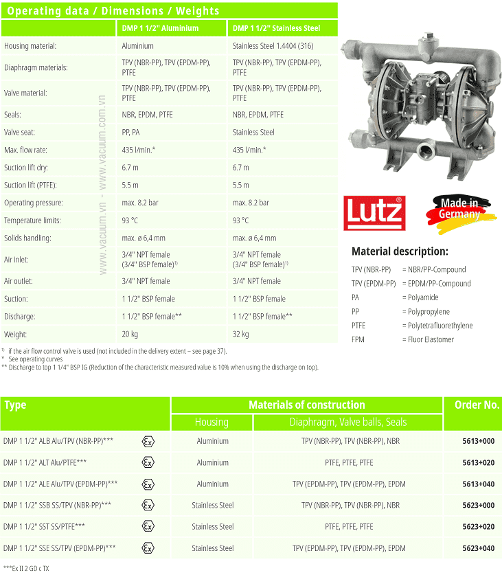 - Bơm màng khí nén Lutz 5623+040, Lutz diaphragm pump 5623+040: thuộc loại bơm màng chống cháy nổ, dòng 1-1/2" Bolted Version (metallic), có thân bơm Stainless Steel (thép không gỉ), màng bơm TPV (EPDM-PP), lưu lượng tối đa: 435 lít/phút, dị vật rắn qua bơm đường kính < 6.4 mm.