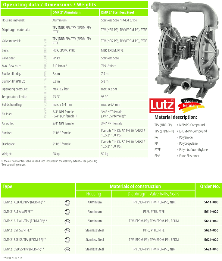- Bơm màng khí nén Lutz 5624+020, Lutz diaphragm pump 5624+020: thuộc loại bơm màng chống cháy nổ, dòng 2" Bolted Version (metallic), có thân bơm Stainless Steel (thép không gỉ), màng bơm TPV (EPDM-PP), lưu lượng tối đa: 719 lít/phút, dị vật rắn qua bơm đường kính < 6.4 mm.