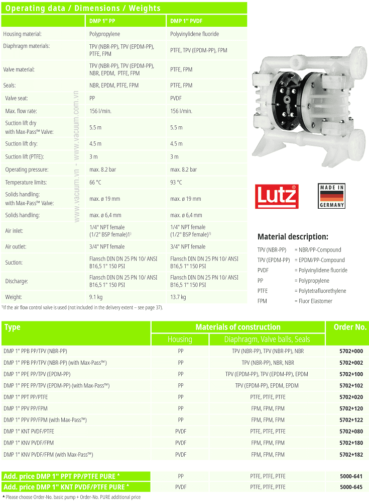 - Vật liệu chính của bơm màng khí nén Lutz 5702-180: thân bơm PVDF (Polyvinylidene fluoride), màng bơm FPM, vật liệu van - sealsFPM, nhiệt độ môi trường làm việc: 930C.