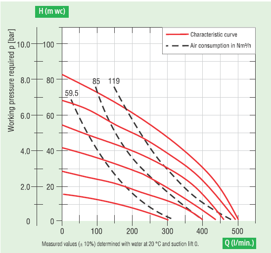 - Hoạt động ở áp khí nén < 8.2 bar. Độ hút sâu max: 3 m.