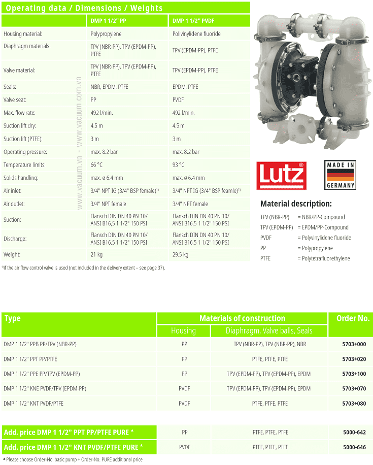 - Bơm màng khí nén Lutz 5703+020, Lutz diaphragm pump 5703+020: thuộc dòng 1-1/2" Bolted Version (non-metallic), có thân bơm PP, màng bơm PTFE, lưu lượng tối đa: 492 lít/phút, dị vật rắn qua bơm đường kính < 6.4 mm.