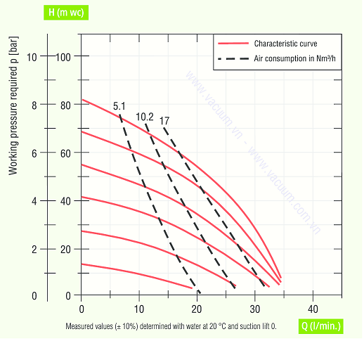 - Hoạt động ở áp khí nén < 8.2 bar. Độ hút sâu max:3 m, nếu bỏ valve: 5.2 m.