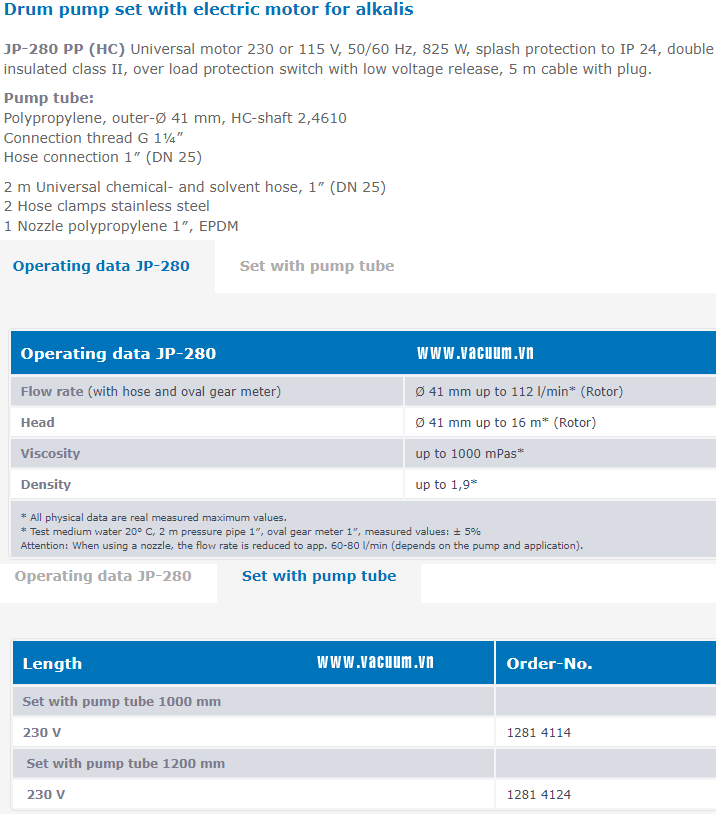 - Bơm thùng phuy Jessberger JP-280 PP (HC), 1281 4114 sử dụng động cơ có công suất 825W, dùng điện 230V/50Hz/1 phase, cấp bảo vệ IP 24, chiều cao cột bơm 1.000 mm, đường kính cột bơm Ø 41 mm (vật liệu PP), chiều dài vòi bơm chịu hóa chất đặc chủng 2 mét , kèm cò bơm.