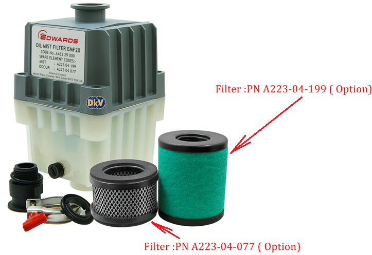 - Lọc tách dầu chân không Edwards EMF20, Edwards oil mist trap for filtering EMF20 (Code: A462-29-000): chuyên dùng cho các loại bơm chân không vòng dầu, Edwards RV12 và E2M18 (phù hợp với bơm chân không vòng dầu 2 cấp có lưu lượng < 20 m3/h). Lọc tách dầu Edwards EMF20 có tác dụng tách (giữ lại) dầu chân không, hạn chế thoát ra ngoài, trong quá trình vận hành.