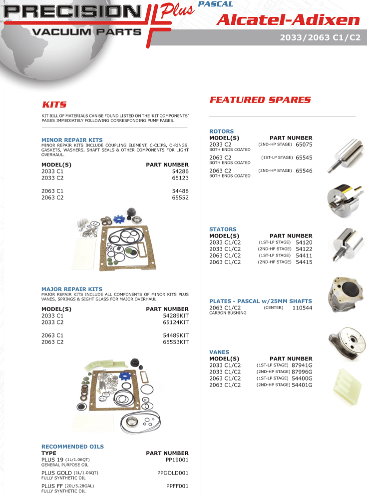- Phụ tùng bơm chân không Alcatel 2033 C2, Repair kits and part for Alcatel vacuum pump 2033 C2: được sản xuất và cung cấp bởi Precision Plus thuộc Tập đoàn Atlas Copco dưới dạng OEM. Các phụ tùng, phụ kiện bơm chân không Alcate 2033 C2 gồm: gioăng phớt, vòng đệm, vòng bi, bích chặn....