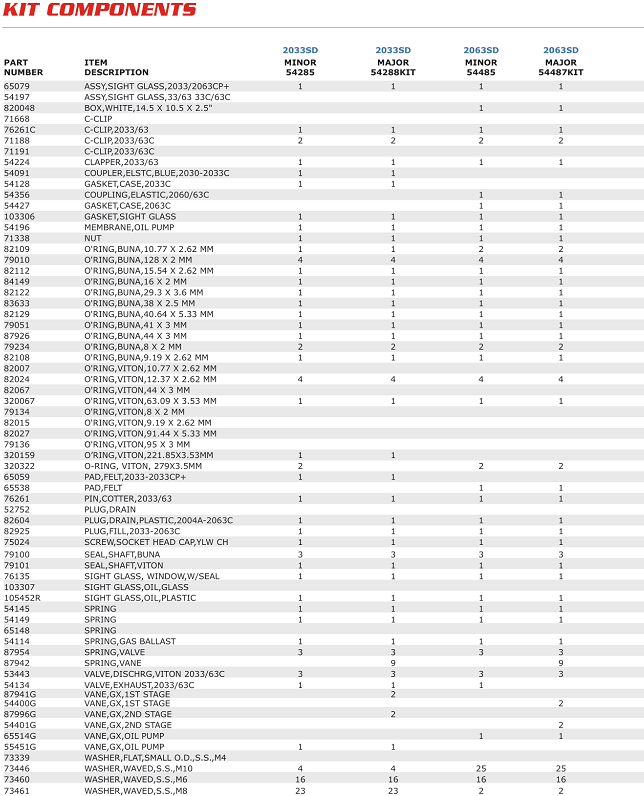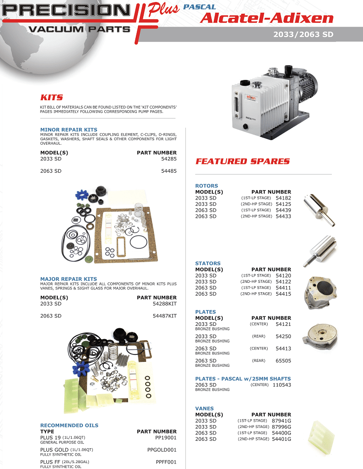 - Phụ tùng bơm chân không Alcatel 2033 SD, Repair kits and part for Alcatel vacuum pump 2033 SD: được sản xuất và cung cấp bởi Precision Plus thuộc Tập đoàn Atlas Copco dưới dạng OEM. Các phụ tùng, phụ kiện bơm chân không Alcate 2033 SD gồm: gioăng phớt, vòng đệm, vòng bi, bích chặn....