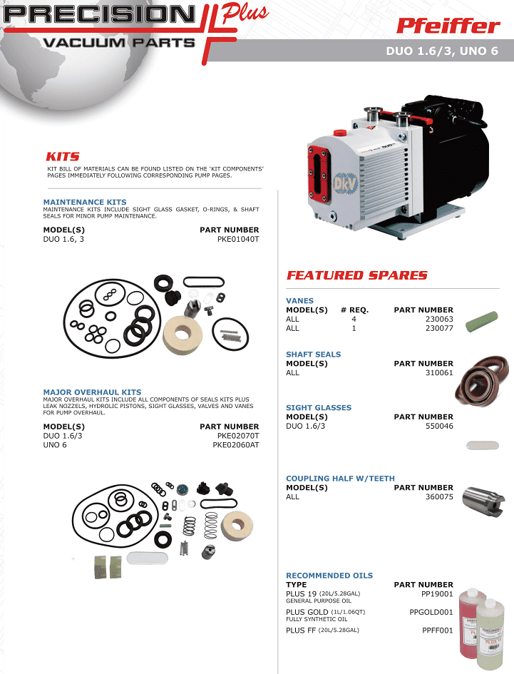 - Phụ tùng bơm chân không Pfeiffer UNO 6, Repair kits and part for Pfeiffer vacuum pump UNO 6 được sản xuất và cung cấp bởi Precision Plus thuộc Tập đoàn Atlas Copco dưới dạng OEM. Các phụ tùng, phụ kiện bơm chân không Pfeiffer UNO 6 gồm: gioăng phớt, vòng đệm, vòng bi, lò xo,....