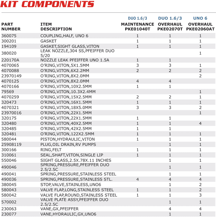 PHỤ TÙNG BƠM CHÂN KHÔNG PFEIFFER UNO 6 | PFEIFFER KITS AND SPARES UNO 6