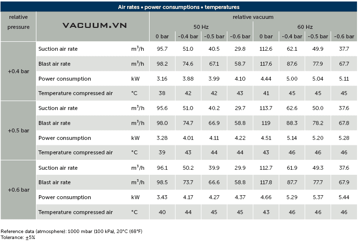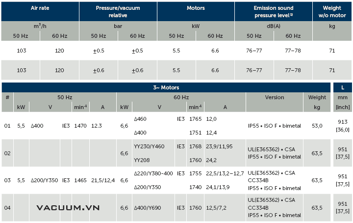 - Bơm chân không Beker DVT 3.100 có độ ồn trung bình: 75 - 76 dB(A), sử dụng động cơ 3 phase 5.5 kW/380-400V/50-60Hz (cấp bảo vệ IP55.ISO F), tốc độ vòng quay động cơ: 1.465 - 1.470 vòng/phút.