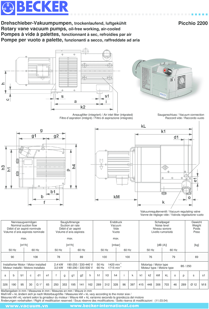 - Bơm chân không Beker PICCHIO 2200 có độ ồn trung bình: 76 dB(A), sử dụng động cơ 3 phase 2.4 kW/380-400V/50-60Hz (cấp bảo vệ IP55.ISO F), tốc độ vòng quay động cơ: 1.420 vòng/phút.