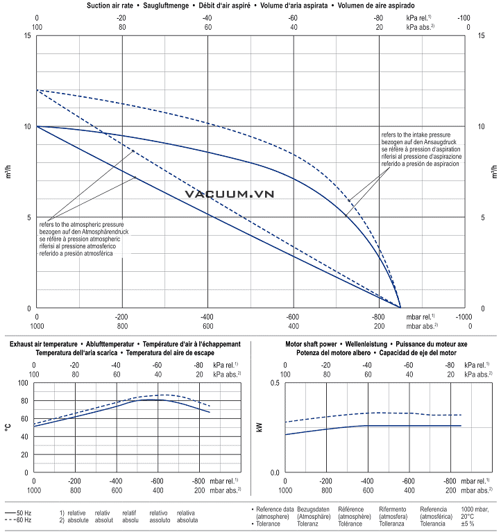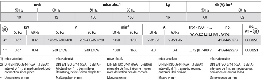 - Bơm chân không Beker VT 4.10 gắn động cơ: 0.37 kW, với sự lựa chọn: 300 - 450V/50 Hz/3ph hoặc 220 - 230V/50 Hz/1ph, cấp bảo vệ IP54, tốc độ động cơ: 1.380 - 1.420 rpm, độ ồn trung bình: 60 dB(A).