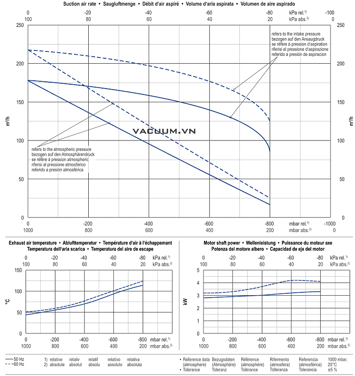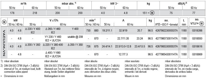 - Bơm chân không Beker VTLF 2.200 có độ ồn trung bình: 75 dB(A), sử dụng động cơ 3 phase 4 kW/380-400V/50-60Hz (cấp bảo vệ IP55.ISO F), tốc độ vòng quay động cơ: 726 - 730 vòng/phút.