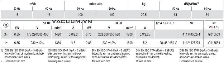 ), thao tác tham khảo video bên dưới. - Bơm chân không Becker VX 4.16 có độ ồn trung bình: 61 dB(A), sử dụng động cơ điện: 0.55 kW, 230V/50Hz/1ph hoặc 380 - 400V/50Hz/3ph (cấp bảo vệ IP54.ISO F), tốc độ vòng quay động cơ: 1.600 - 1.700 rpm.