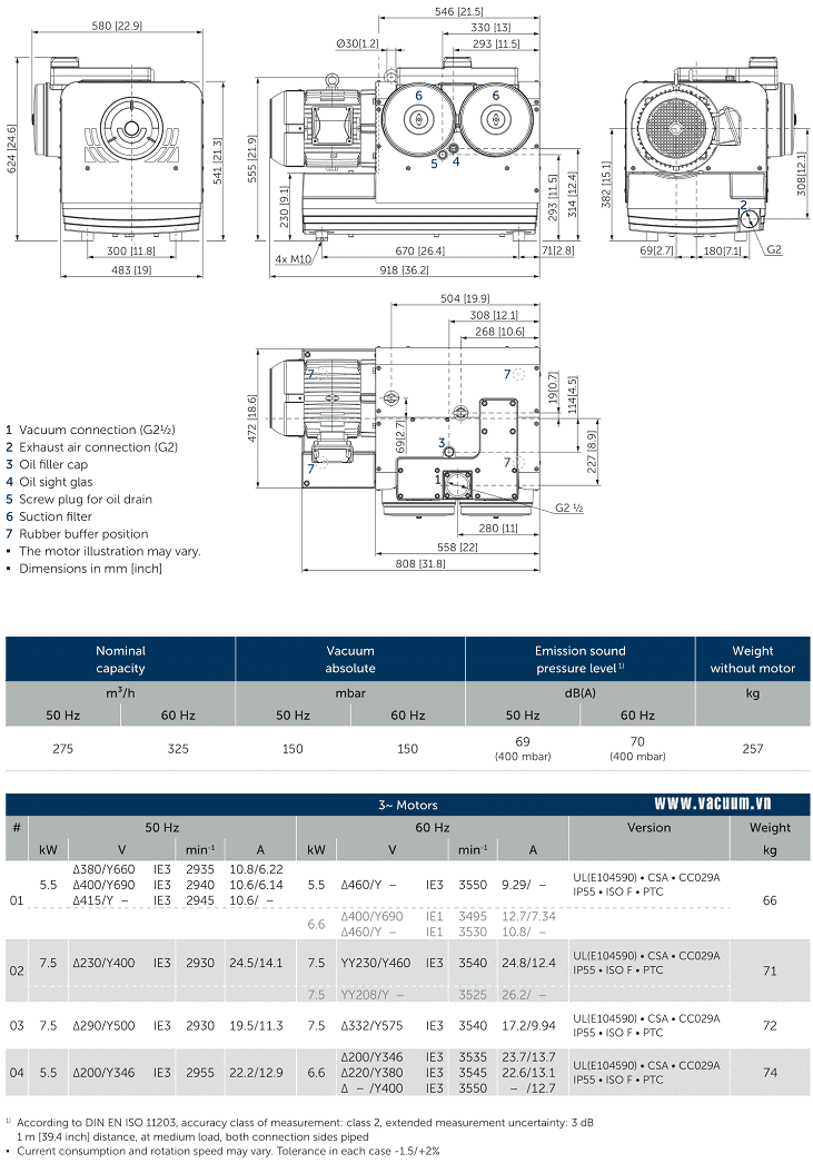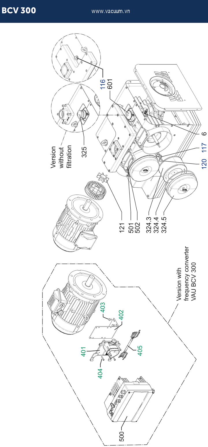 - Bơm chân không Becker BCV 300 sử dụng động cơ 5.5 - 7.5 kW/230 - 400V/50Hz/3ph, cấp bảo vệ IP55, tốc độ vòng quay động cơ: 3.530 - 3.545 vòng/phút, có độ ồn trung bình: 69 dB(A).