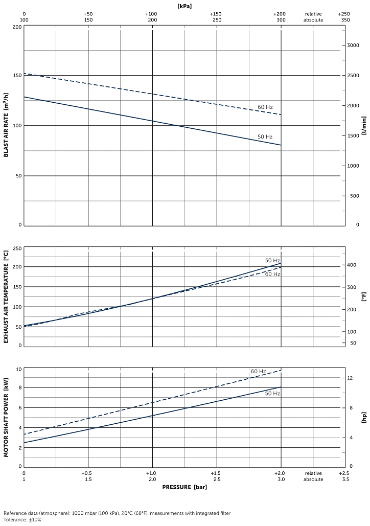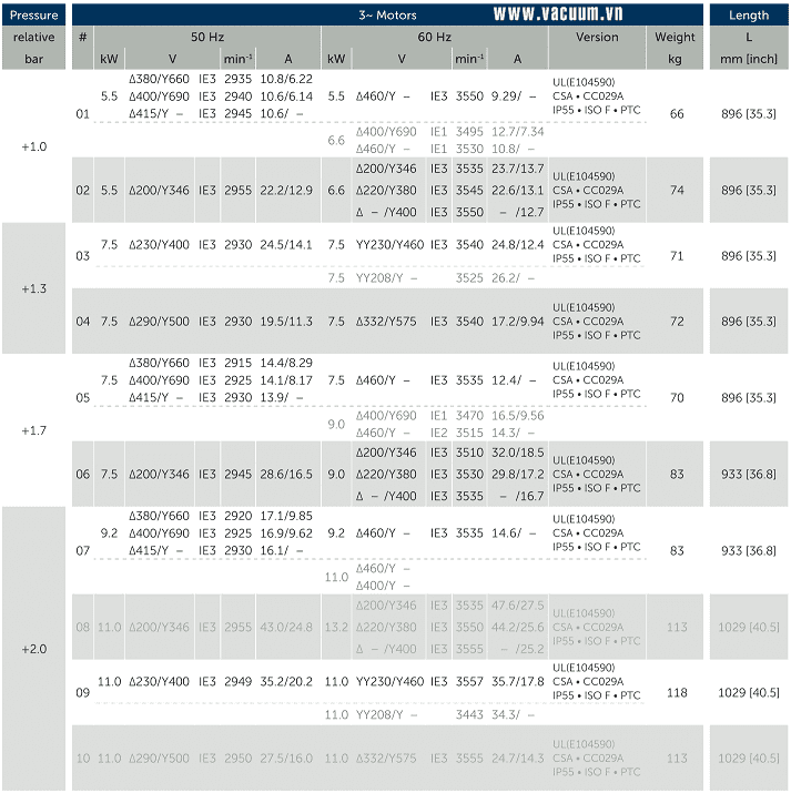 - Máy nén khí Becker BCP 150 sử dụng động cơ 5.5 - 11 kW/230 - 400V/50Hz/3ph, cấp bảo vệ IP55, tốc độ vòng quay động cơ: 2.890 - 2.955 vòng/phút, có độ ồn trung bình: 77 dB(A).