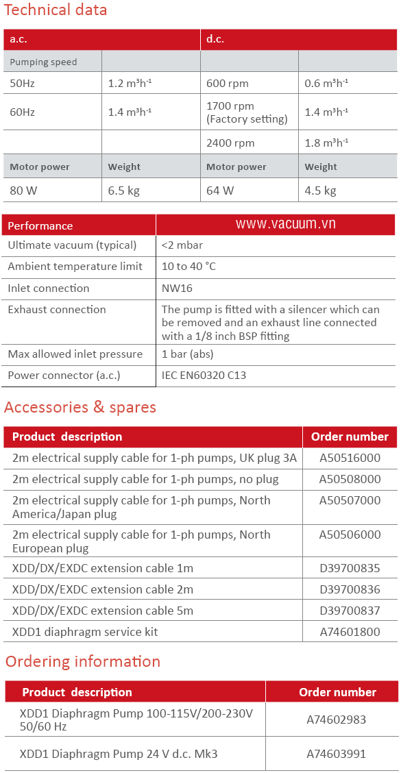 - Bơm chân không Edwards XDD1 sử dụng động cơ 80 W/200 -240V/50Hz/1ph/AC hoặc 64 W/24V/DC, tiêu chuẩn IEC EN60320 C19, tốc độ quay động cơ: 600 rpm. Các cổ hút/xả theo tiêu chuẩn NW16.
