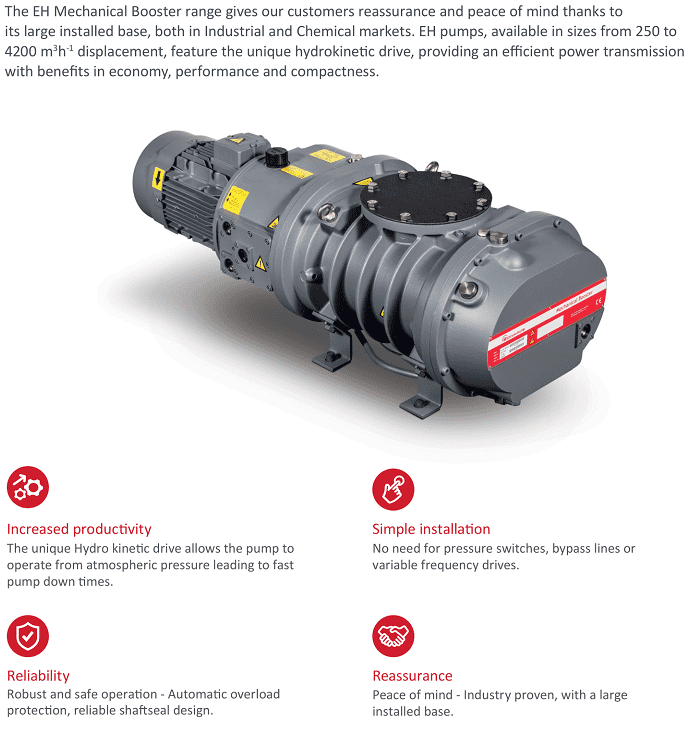 - Bơm tăng áp chân không Edwards EH250, Edwards roots booster pump EH250 là loại bơm tăng áp cỡ trung bình, lưu lượng max: 310 m3/h, phổ dụng trong công nghiệp. Bơm tăng áp chân không Edwards EH250 có mức chênh độ chân không trong quá trình làm việc liên tục: 0 - 180 mbar .
