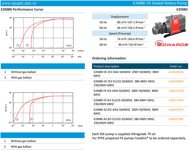 - Bơm chân không Edwards E2M80 có độ ồn max: 70 dB(A), sử dụng động cơ: 2.2 kW, điện áp 380-400V/50-60Hz/3ph, cấp bảo vệ IP55, tiêu chuẩn IEC EN60320 C13.