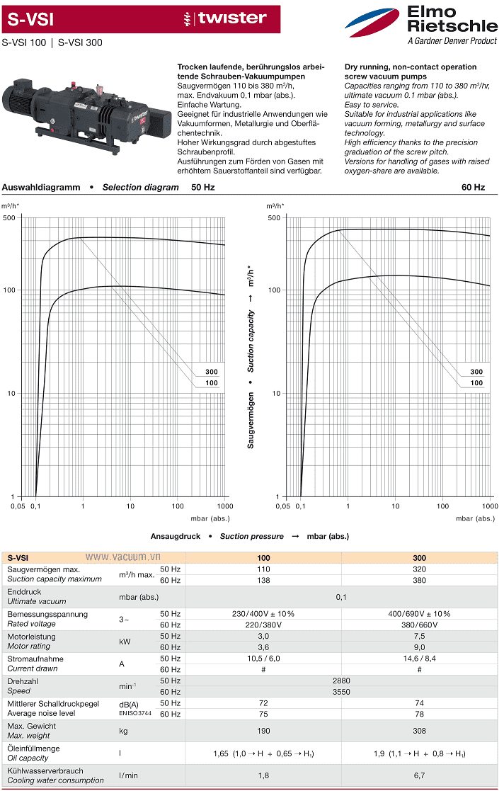 - Bơm chân không khô trục vít Elmo Rietschle S-VSI 100 có độ ồn max: 72 dB(A). Sử dụng động cơ: 3 kW, điện áp 380V/50Hz/3ph, tiêu chuẩn DIN EN 60034, tốc độ vòng quay động cơ: 2.880 vòng/phút.