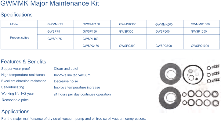- Bộ sửa chữa, bảo trì bơm chân không Geowell GWMMK75, Geowell maijor maintenace kit GWMMK75 chuyên dùng để bảo trì, bảo dưỡng đầy đủ cho bơm chân không khô Geowell GWSP75 và Geowell GWSPL75.