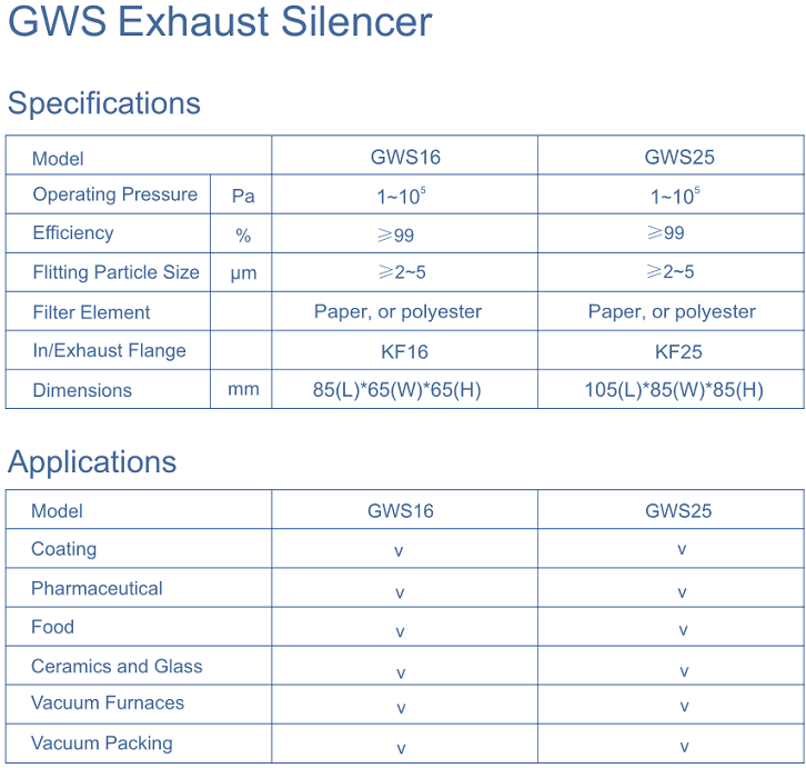 - Bộ lọc chân không đầu ra Geowell GWS25, Geowell oil free scroll vacuum pump exhaust silencer filter GWS25 chuyên dùng cho bơm chân không không dầu của hãng Geowell có tiêu chuẩn kẹp KF 25, được lắp trên đường ra xả khí của bơm.