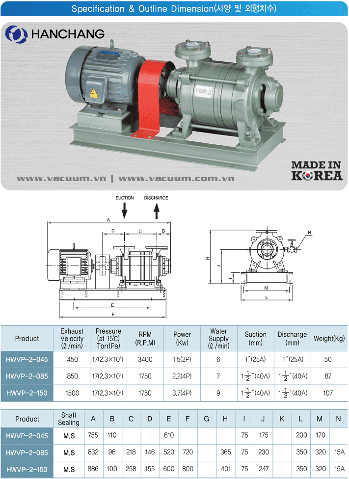 - Bơm chân không vòng nước Hanchang HWVP-2-150 được sản xuất tại Nhà máy của Hanchang Vacuum., Co Ltd, thành lập năm 1975, ở tỉnh Gyeongsangnam, Korea, chuyên sản xuất bơm chân không các loại. Made in Korea.