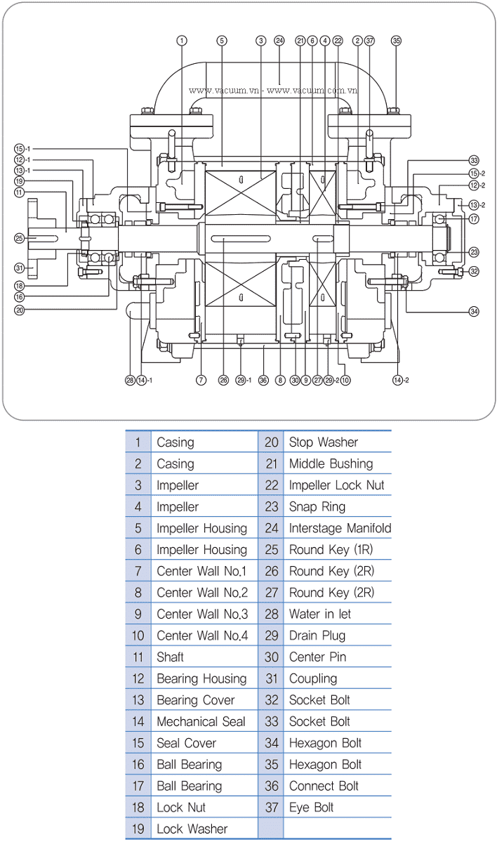 - Bơm chân không vòng nước Hanchang HWVP-2-150, Hanchang liquid ring vacuum pump HWVP-2-150: thuộc dạng bơm hút chân không vòng nước (Liquid vacuum pump), 2 cấp, có lưu lượng: 1500 lít/phút (90 m3h), độ chân không đạt 17 torr (2.3x103 Pa), lượng nước tiêu thụ: 9 lít/phút, chuyên dùng để hút chân không trong công nghiệp.