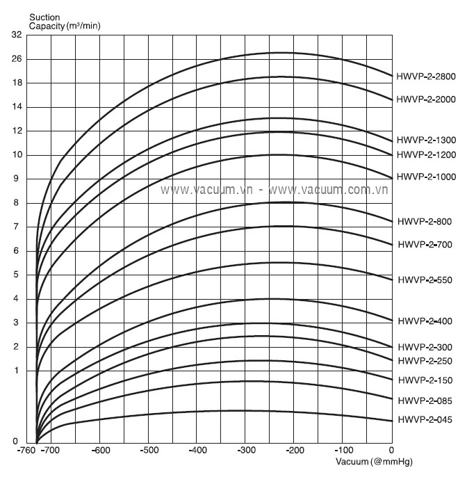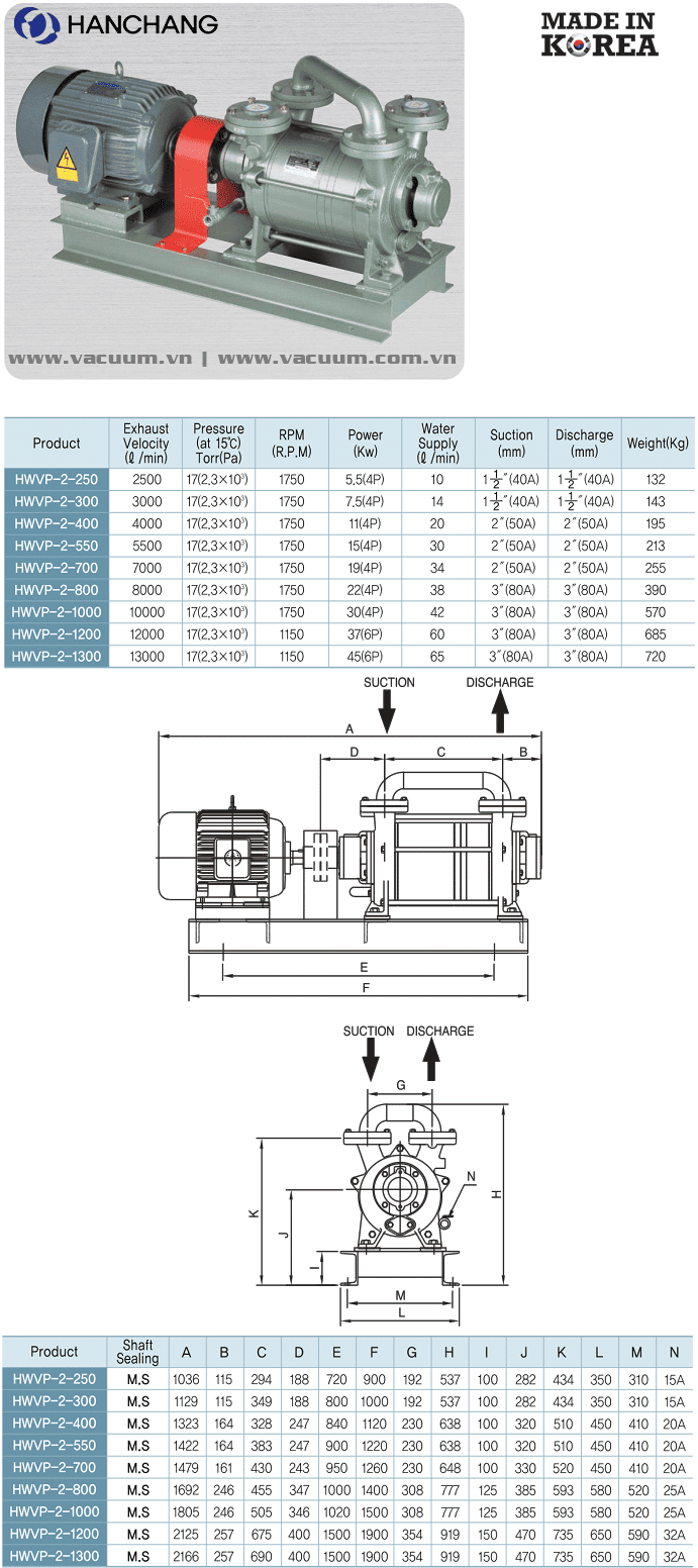 - Bơm chân không vòng nước Hanchang HWVP-2-550, Hanchang liquid ring vacuum pump HWVP-2-550: thuộc dạng bơm hút chân không vòng nước (Liquid vacuum pump), 2 cấp, có lưu lượng: 5500 lít/phút (330 m3h), độ chân không đạt 17 torr (2.3x103 Pa | 23 mbar), lượng nước tiêu thụ: 30 lít/phút, chuyên dùng để hút chân không trong công nghiệp.