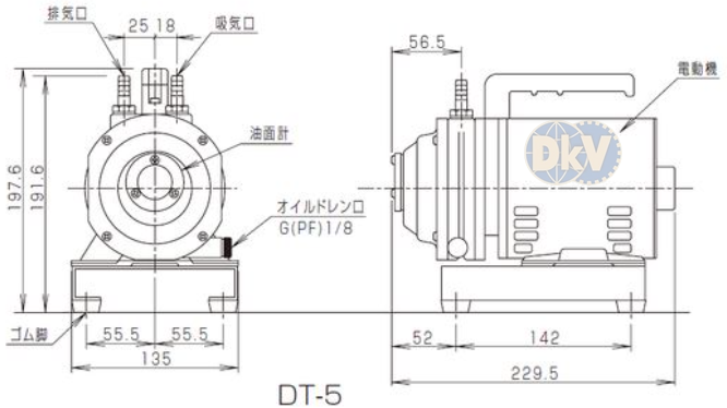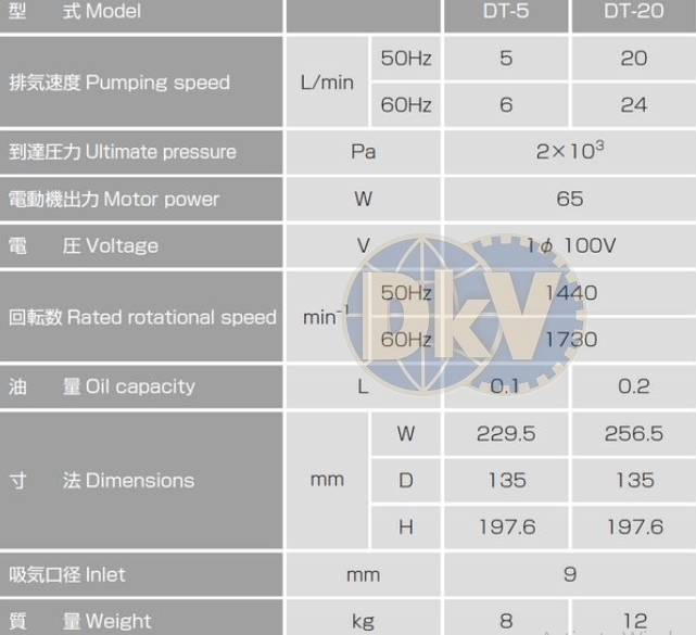 - Bơm chân không Sato DT-5 sử dụng động cơ: 0.65 kW, điện áp 1ph/100V/50 Hz, tốc độ vòng quay: 1.440 vòng/phút, size cổng kết nối khí vào: 9 mm.